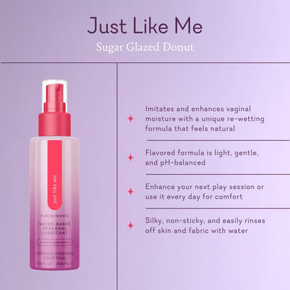 Finally, a lubricant that feels just like you. Just Like Me is perfect for getting intimate or everyday use. This light, water-based and pH-balanced lubricant is carefully formulated to imitate vaginal moisture. Apply as needed and enjoy.